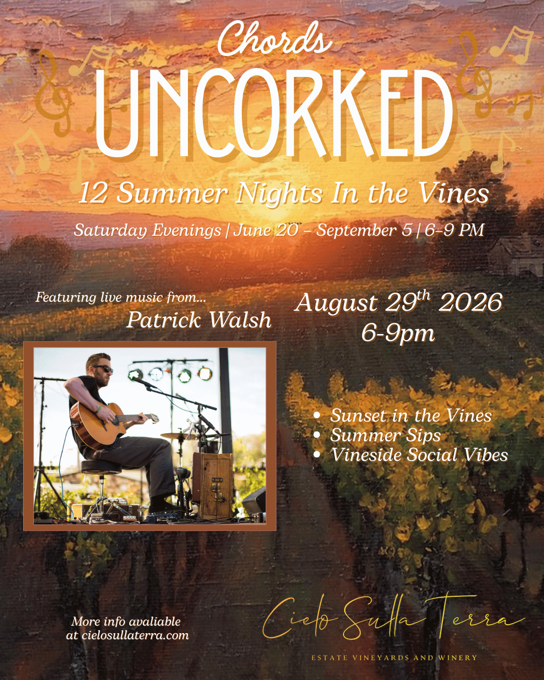 Admission is for a winery marketing and hospitality experience. Music is provided as part of the overall guest atmosphere. Tickets: https://www.squadup.com/events/chords-uncorked-2026?legacy=0