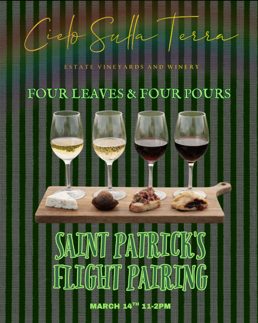 Celebrate St. Patrick’s Day under the vines with Four Leaves & Four Pours, a festive wine and bite experience at Cielo Sulla Terra.